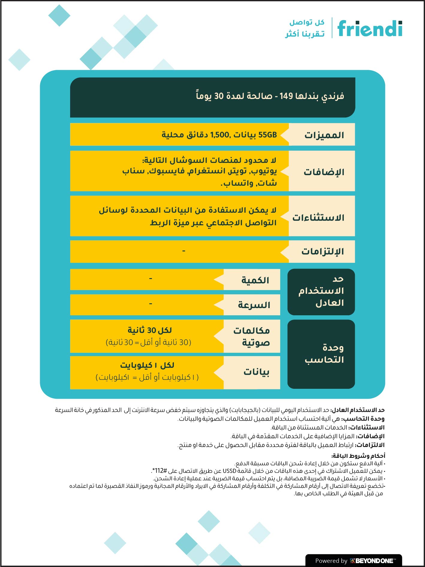 | 99.00 ريال | 113.85 ريال | 60 جيجابايت | 30 أيام | |